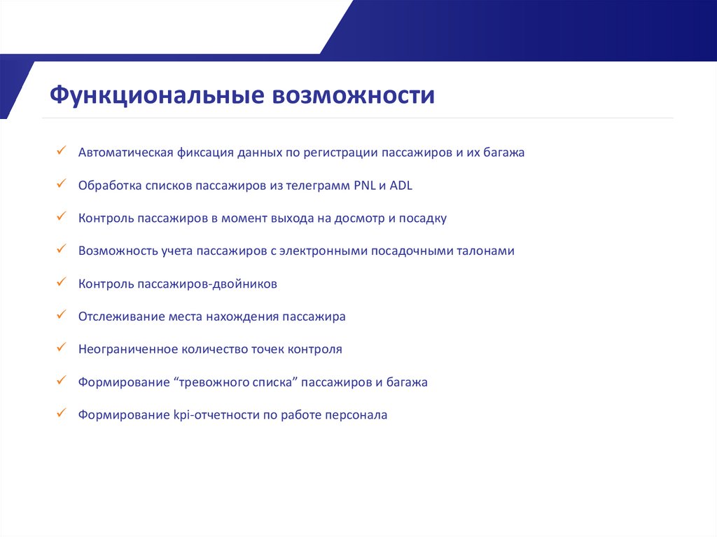 Функциональные возможностиАвтоматическая фиксация данных по регистрации пассажиров и их багажа