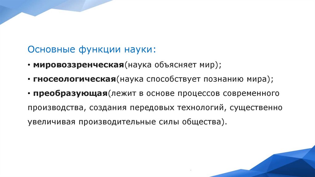Основные функции науки:• мировоззренческая(наука объясняет мир);
