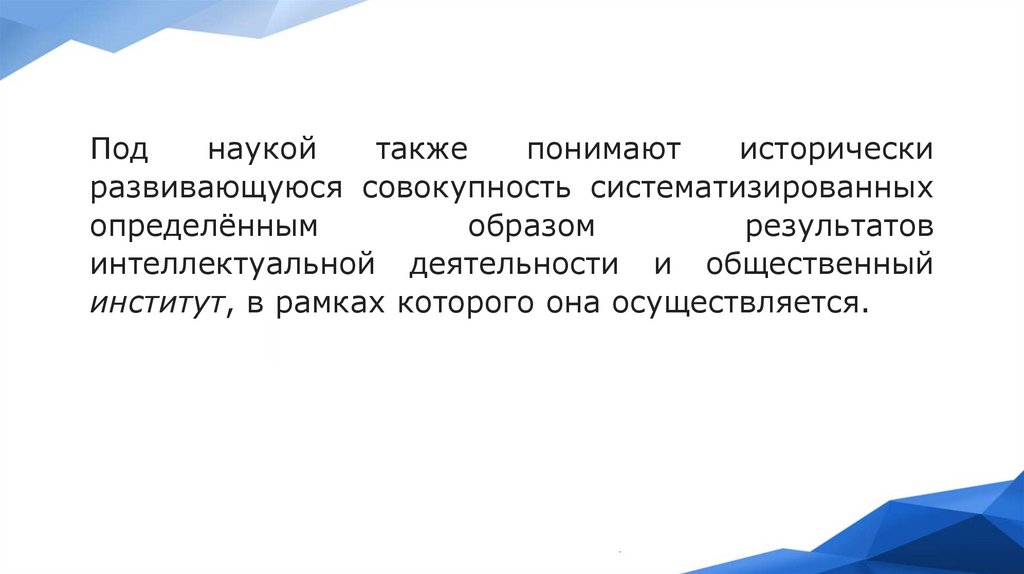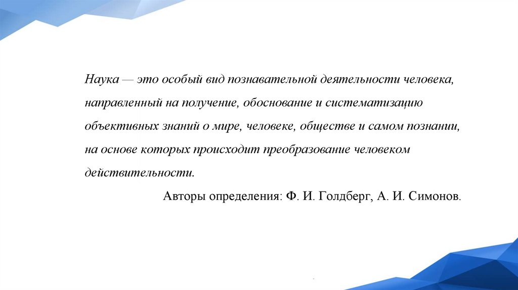 Наука — это особый вид познавательной деятельности человека,направленный на получение, обоснование и систематизацию
