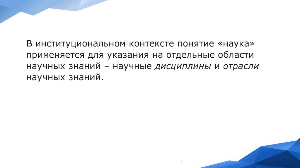 В институциональном контексте понятие «наука»применяется для указания на отдельные области
