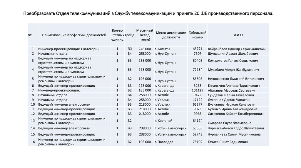 Преобразовать Отдел телекоммуникаций в Службу телекоммуникаций и принять 20 ШЕ производственного персонала:№