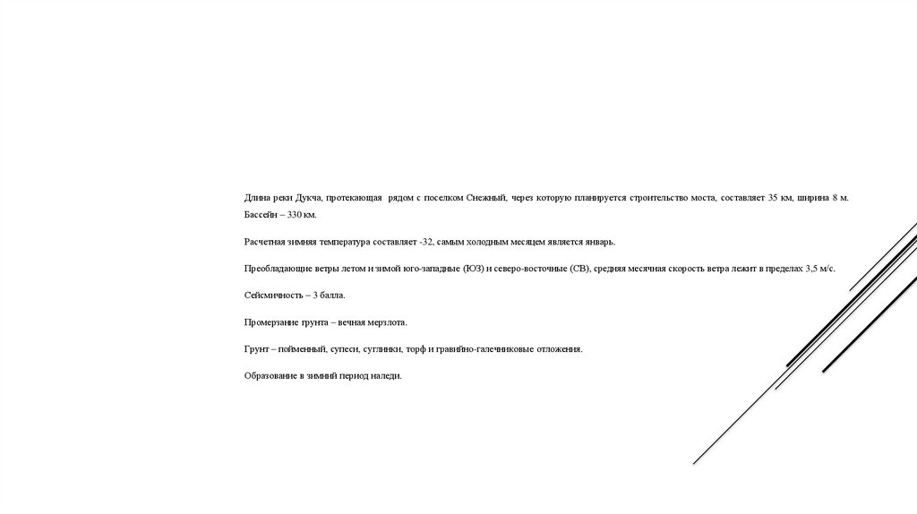 Длина реки Дукча, протекающая рядом с поселком Снежный, через которую планируется строительство моста, составляет 35 км, ширина 8 м.