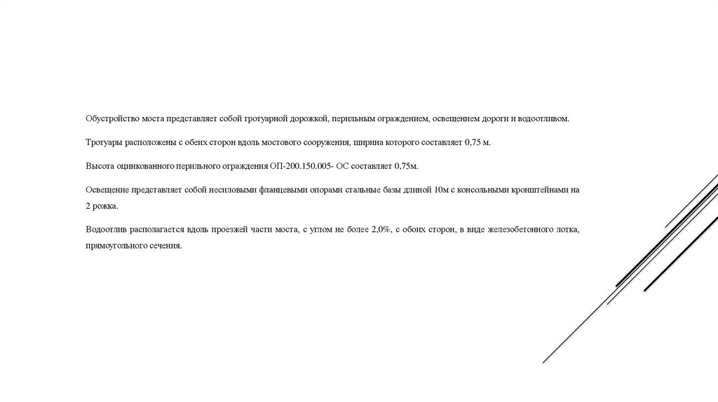 Водоотлив располагается вдоль проезжей части моста, с углом не более 2,0%, с обоих сторон, в виде железобетонного лотка,