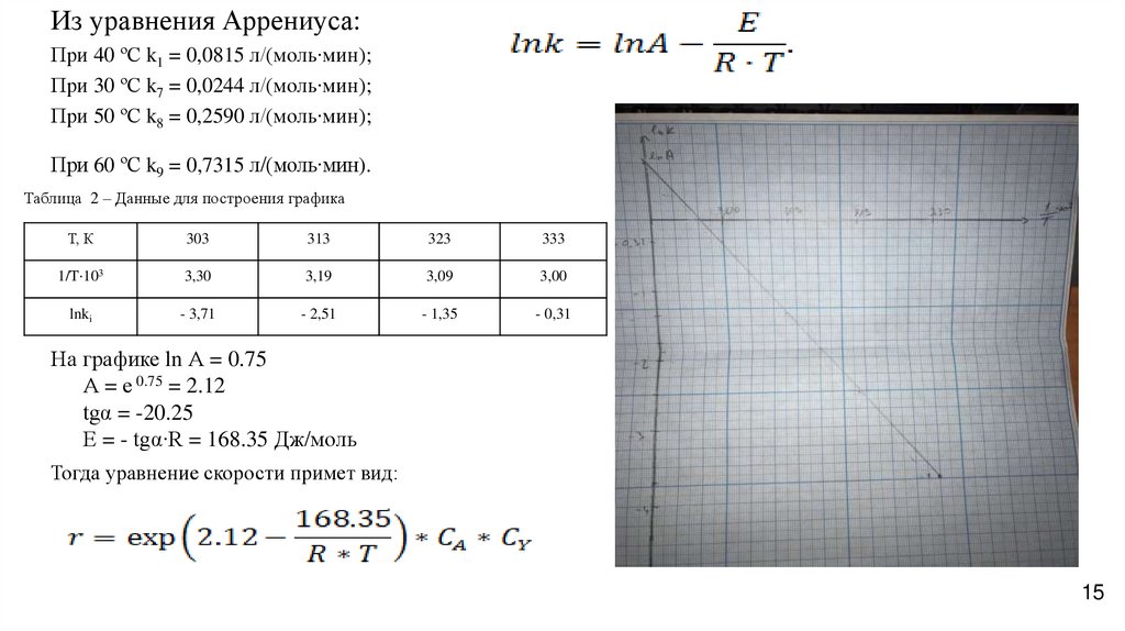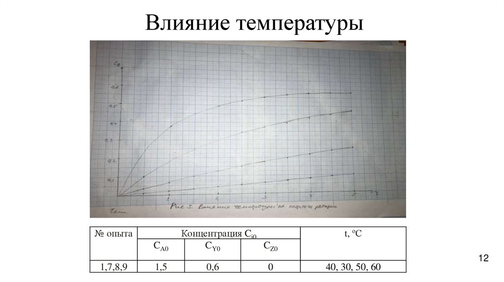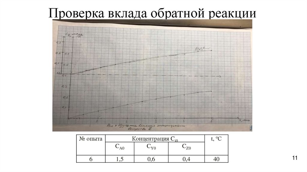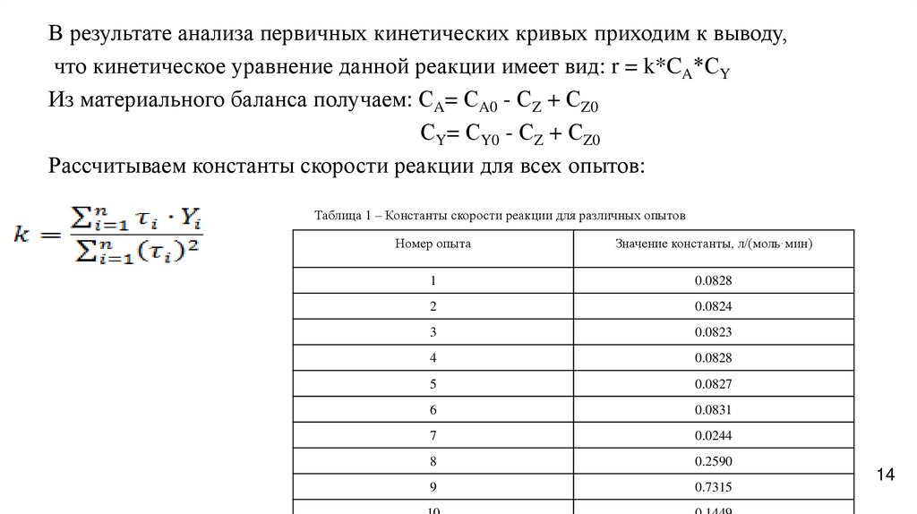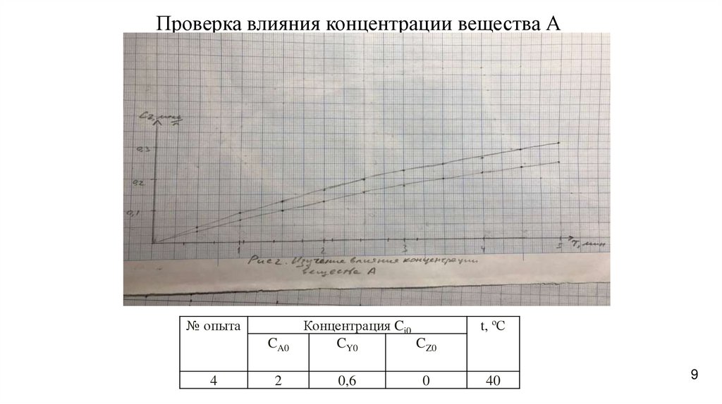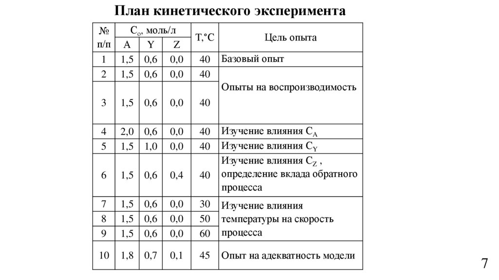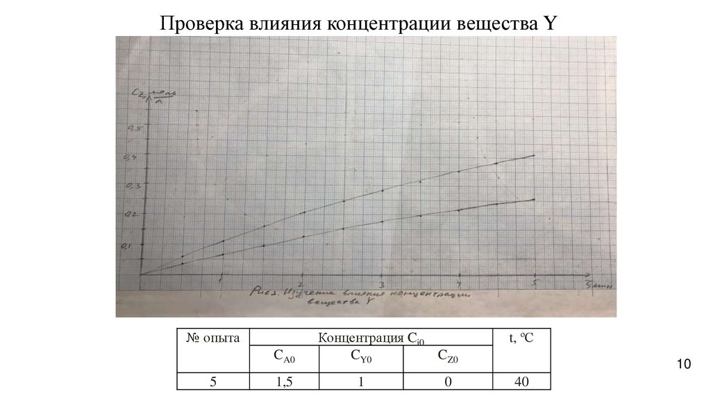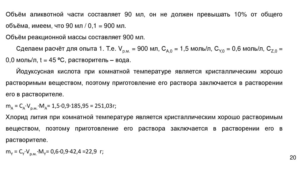 Сделаем расчёт для опыта 1. Т.е. Vр.м. = 900 мл, СA,0 = 1,5 моль/л, СY,0 = 0,6 моль/л, СZ,0 =
