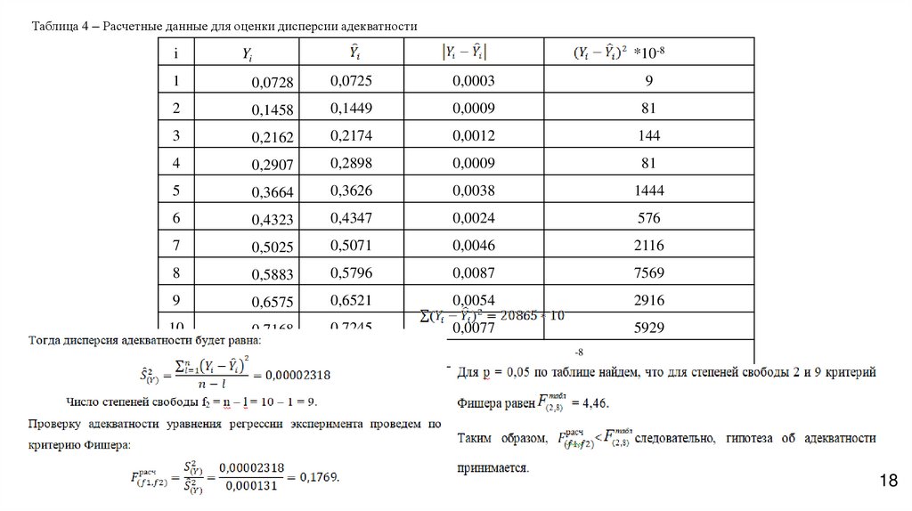Таблица 4 – Расчетные данные для оценки дисперсии адекватностиi