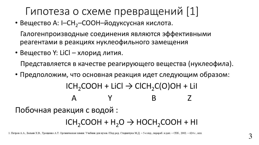 Гипотеза о схеме превращений [1]• Вещество А: I–CH2–COOH–йодуксусная кислота.