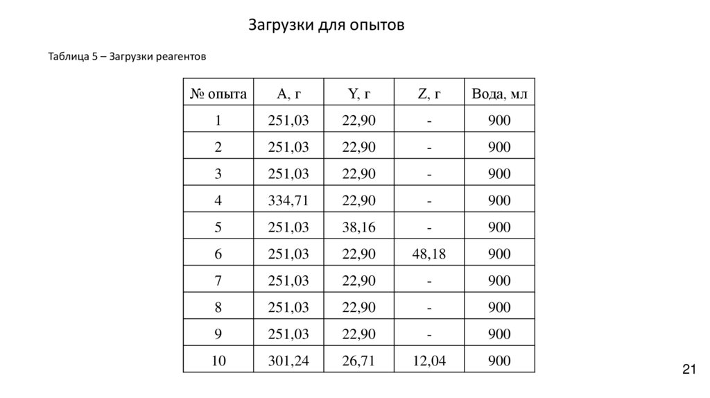 Загрузки для опытовТаблица 5 – Загрузки реагентов