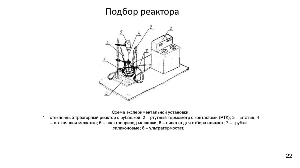 1 – стеклянный трёхгорлый реактор с рубашкой; 2 – ртутный термометр с контактами (РТК); 3 – штатив; 4