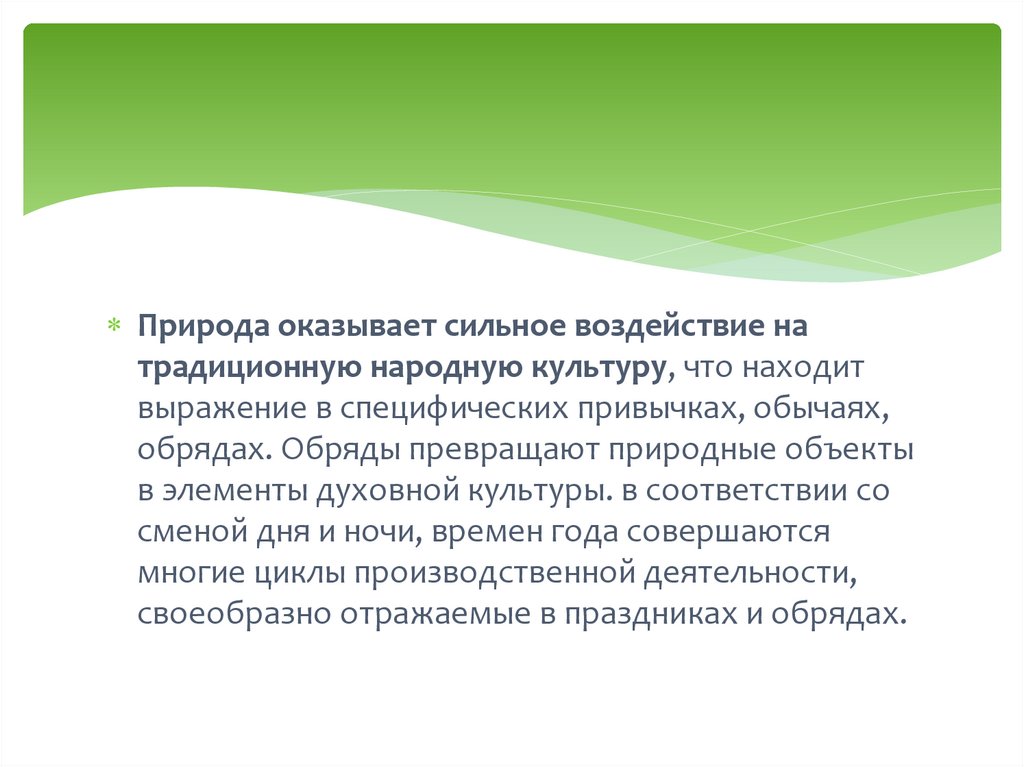 Природа оказывает сильное воздействие натрадиционную народную культуру, что находит