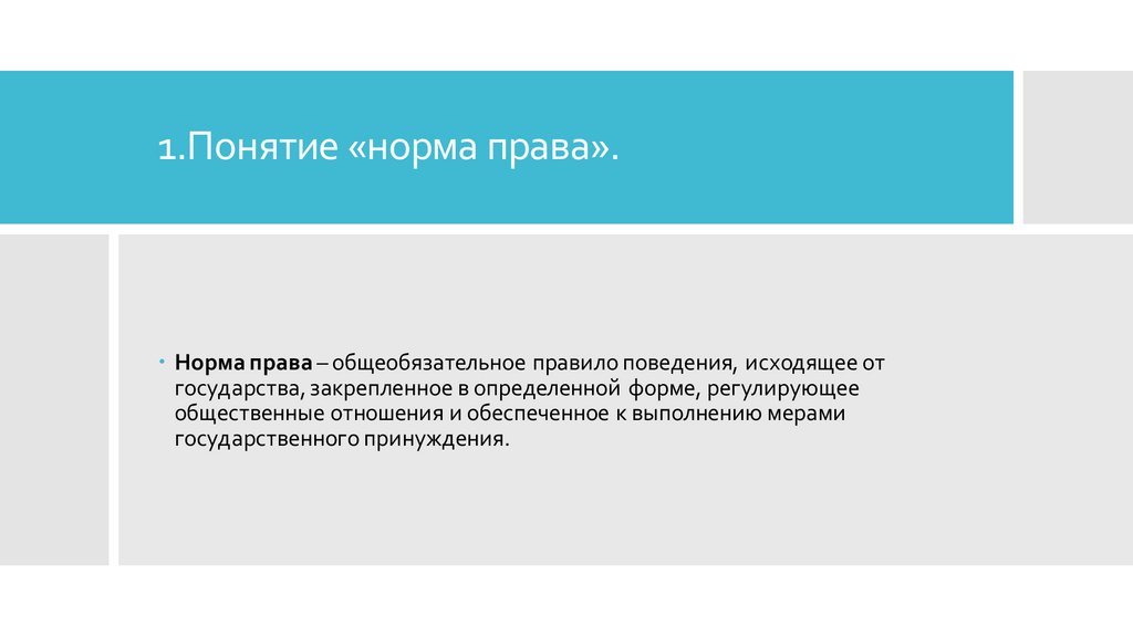 1.Понятие «норма права».Норма права – общеобязательное правило поведения, исходящее от