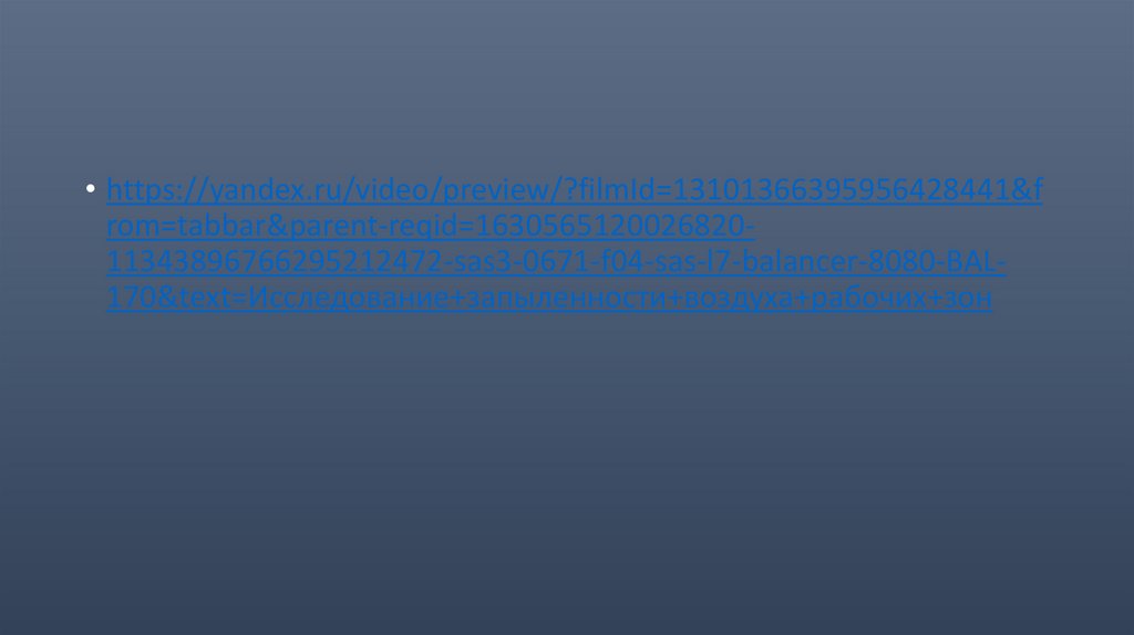 • https://yandex.ru/video/preview/?filmId=13101366395956428441&from=tabbar&parent-reqid=163056512002682011343896766295212472-sas3-0671-f04-sas-l7-balancer-8080-BAL170&text=Исследование+запыленности+воздуха+рабочих+зон