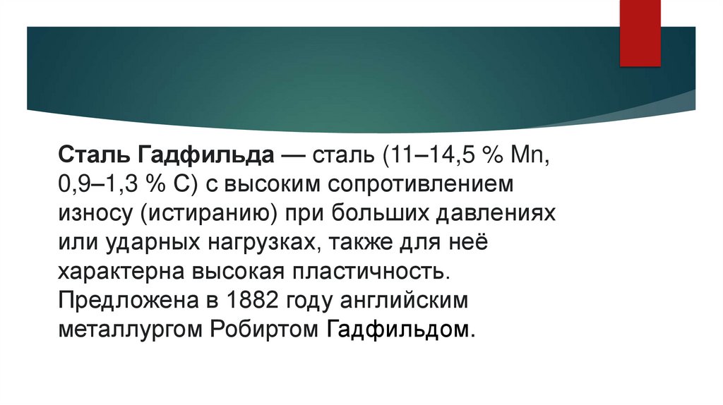 Сталь Гадфильда — сталь (11–14,5 % Mn,0,9–1,3 % С) с высоким сопротивлением