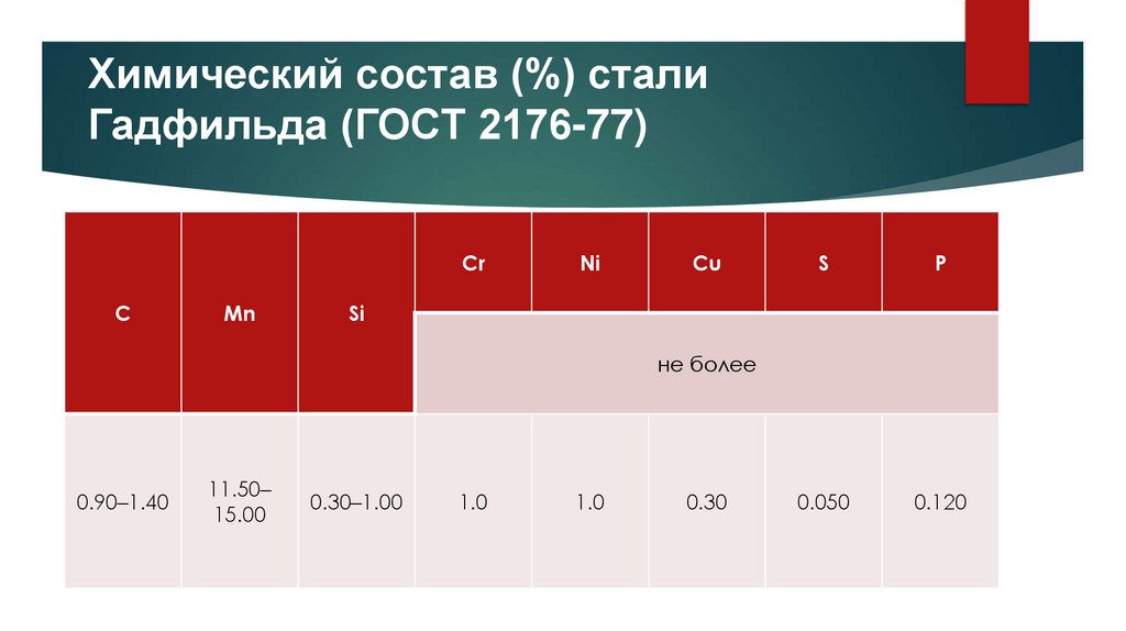 Химический состав (%) сталиГадфильда (ГОСТ 2176-77)