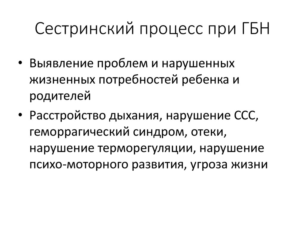 Сестринский процесс при ГБН• Выявление проблем и нарушенных
