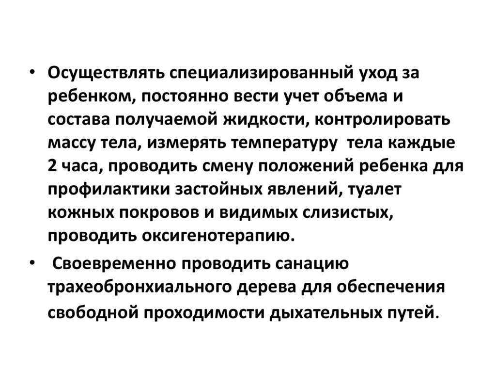 • Осуществлять специализированный уход заребенком, постоянно вести учет объема и
