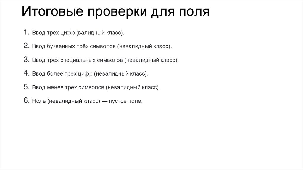 Итоговые проверки для поля1. Ввод трёх цифр (валидный класс).