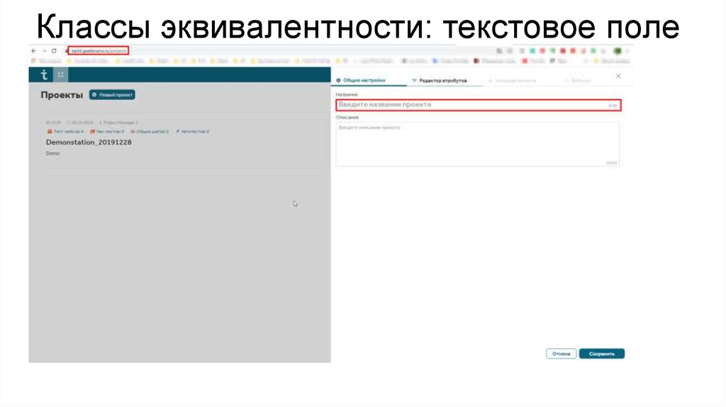 Классы эквивалентности: текстовое поле1.Невалидный класс — пустое поле, то есть нулевая