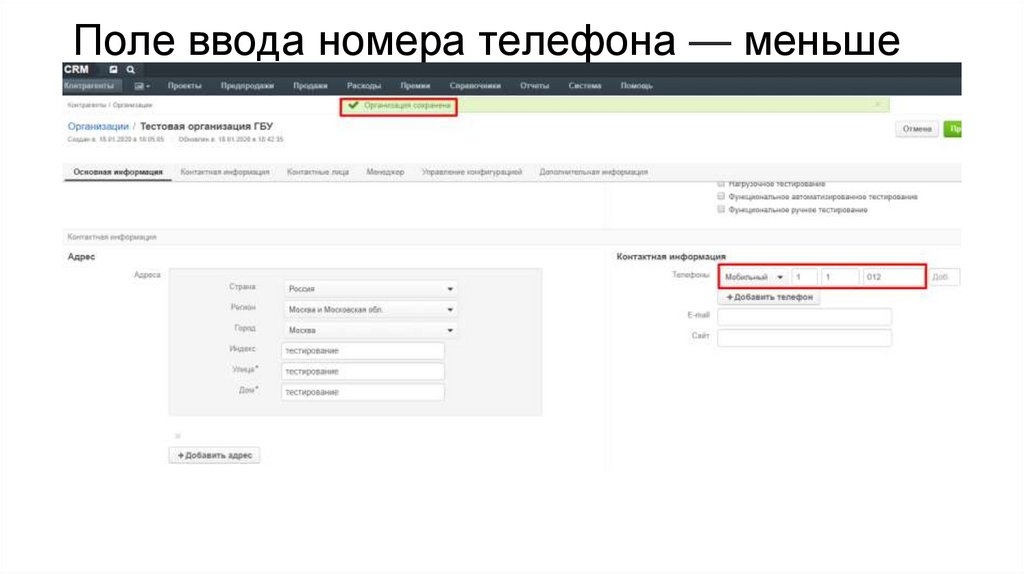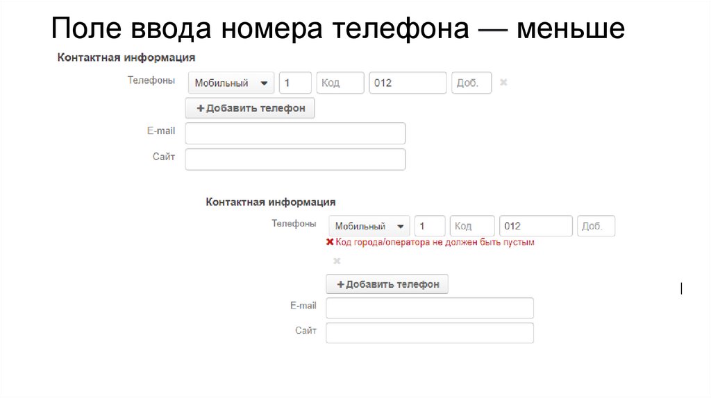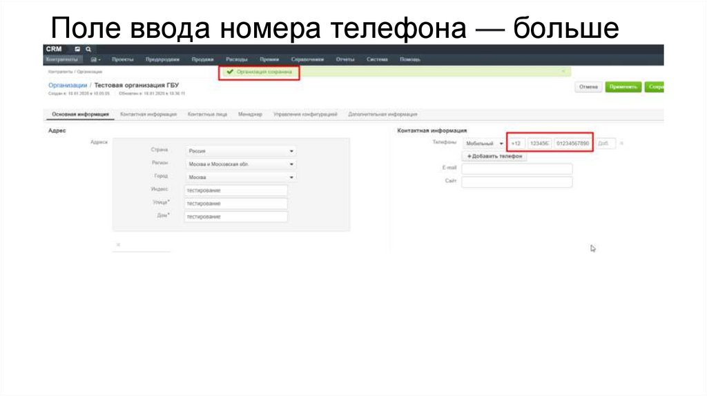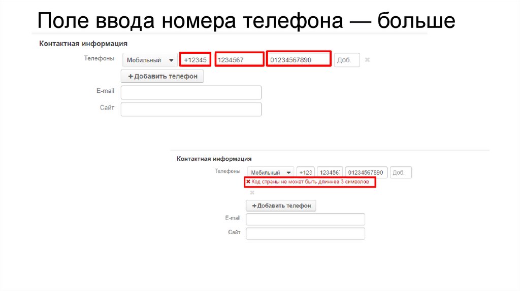 Номер телефона — в зависимости от страны: может быть от 4 до 10 символов.