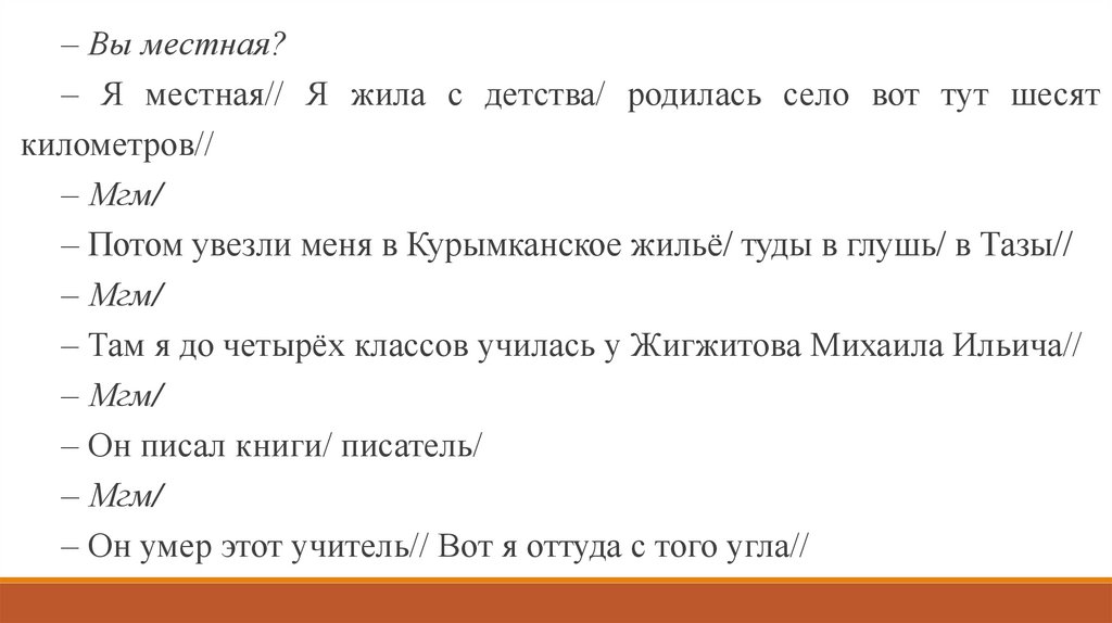 – Вы местная?– Я местная// Я жила с детства/ родилась село вот тут шесят