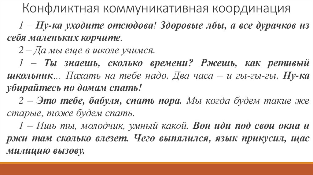 Конфликтная коммуникативная координация1 – Ну-ка уходите отсюдова! Здоровые лбы, а все дурачков из