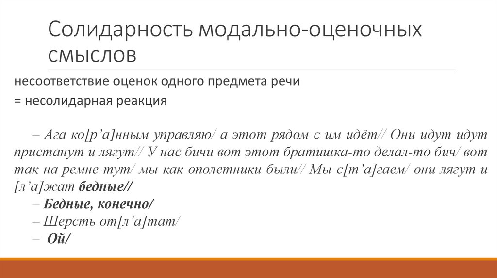 ◦ солидарностью модально-оценочных смыслов речевых