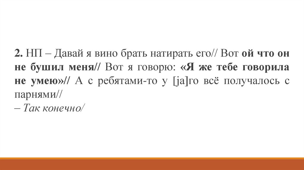 2. НП – Давай я вино брать натирать его// Вот ой что онне бушил меня// Вот я говорю: «Я же тебе говорила