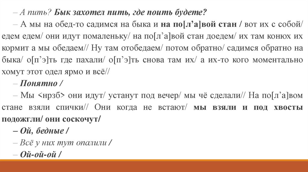 – А пить? Бык захотел пить, где поить будете?– А мы на обед-то садимся на быка и на по[л’а]вой стан / вот их с собой/