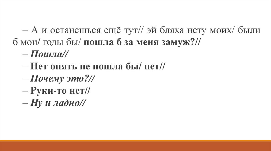 – А и останешься ещё тут// эй бляха нету моих/ былиб мои/ годы бы/ пошла б за меня замуж?//