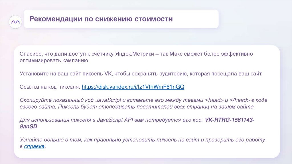 Рекомендации по снижению стоимостиСпасибо, что дали доступ к счётчику Яндек.Метрики – так Макс сможет более эффективно