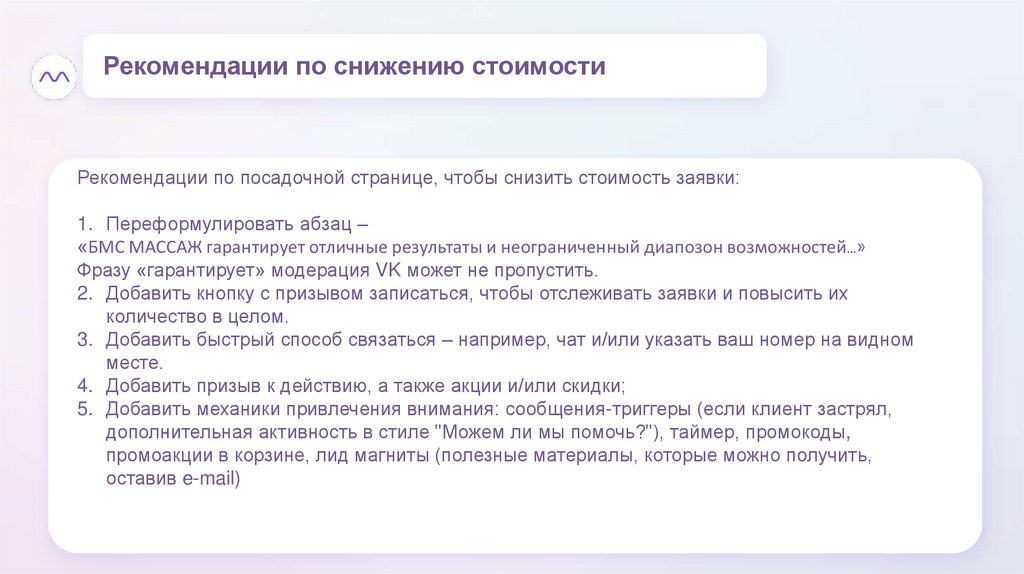 Рекомендации по снижению стоимостиРекомендации по посадочной странице, чтобы снизить стоимость заявки, нужно добавить