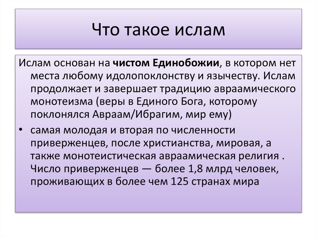 Что такое исламИслам основан на чистом Единобожии, в котором нет