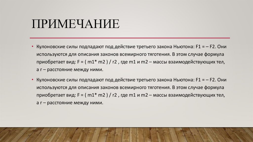 ПРИМЕЧАНИЕ• Кулоновские силы подпадают под действие третьего закона Ньютона: F1 = – F2. Они