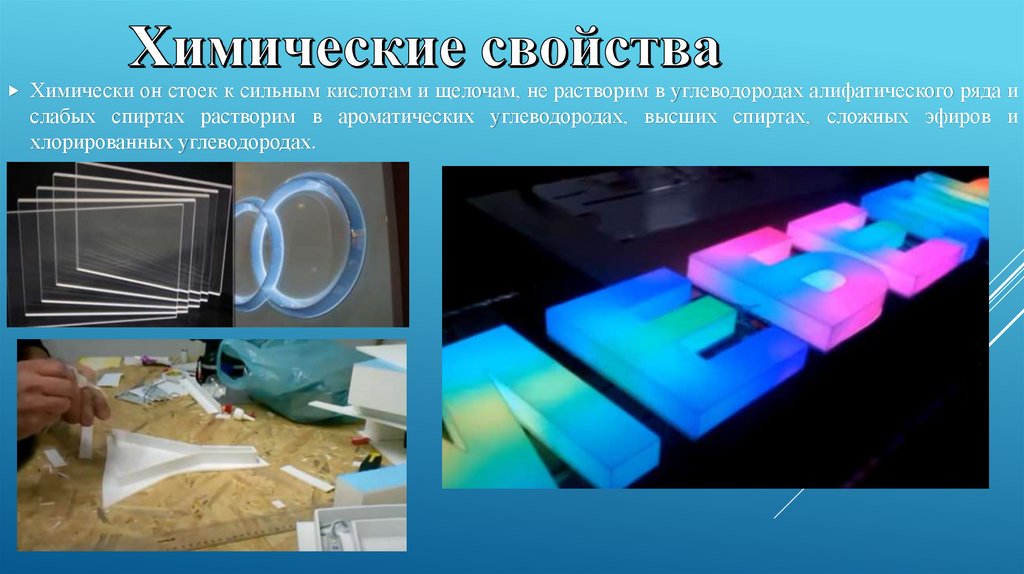 Химически он стоек к сильным кислотам и щелочам, не растворим в углеводородах алифатического ряда ислабых спиртах растворим в ароматических углеводородах, высших спиртах, сложных эфиров и