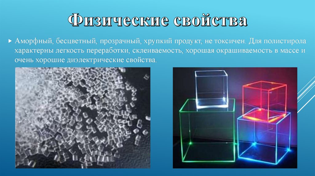 Аморфный, бесцветный, прозрачный, хрупкий продукт, не токсичен. Для полистиролахарактерны легкость переработки, склеиваемость, хорошая окрашиваемость в массе и