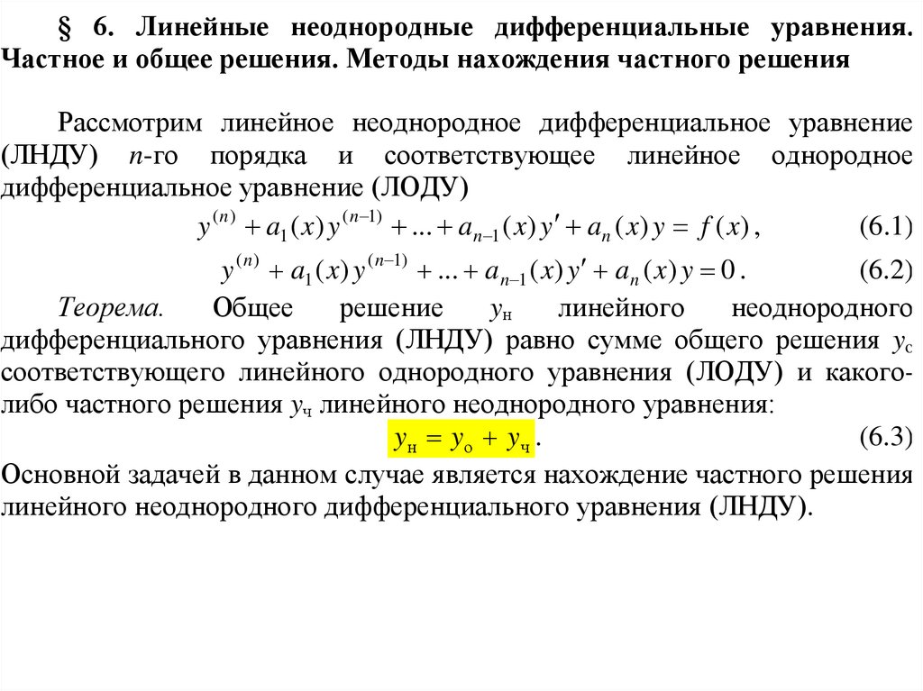 § 6. Линейные неоднородные дифференциальные уравнения.Частное и общее решения. Методы нахождения частного решения