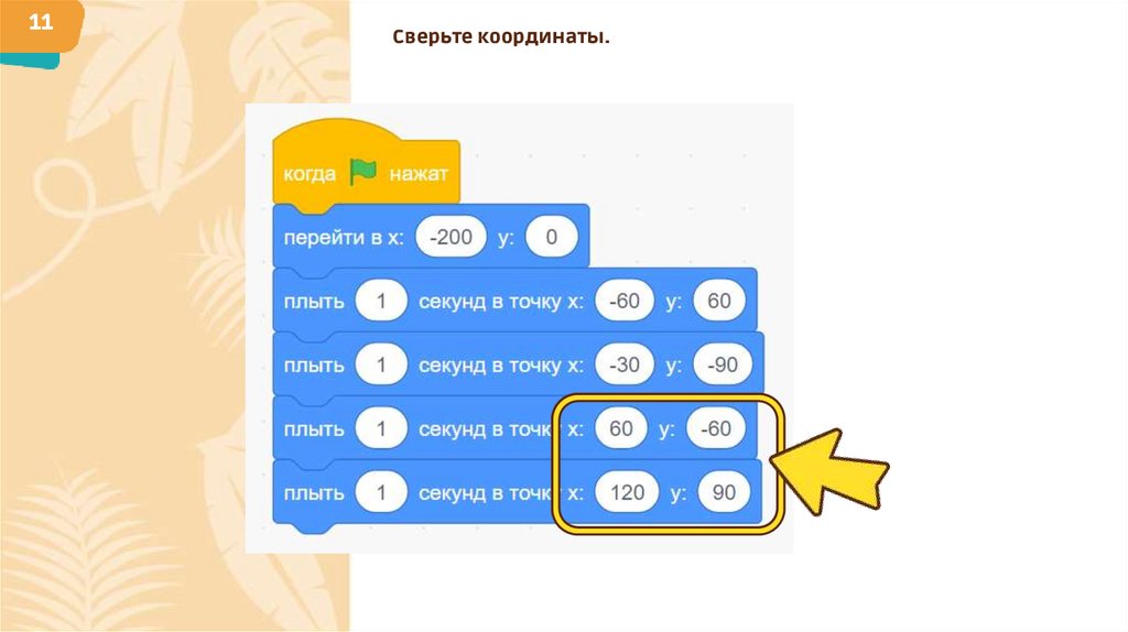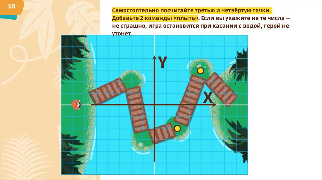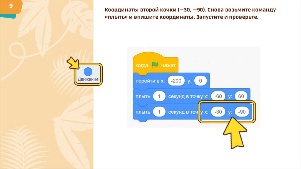 9Координаты второй кочки (—30, —90). Снова возьмите команду