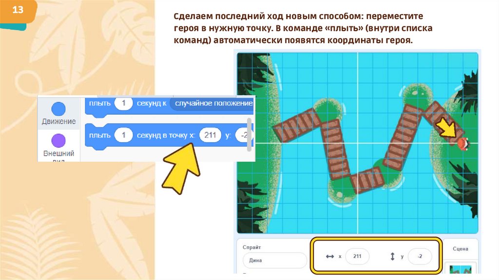 помощью команды «плыть» из раздела «Движение». Эта команда