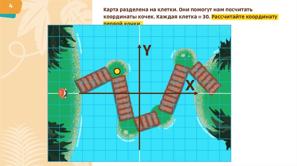 координаты кочек. Каждая клетка = 30. Рассчитайте координату