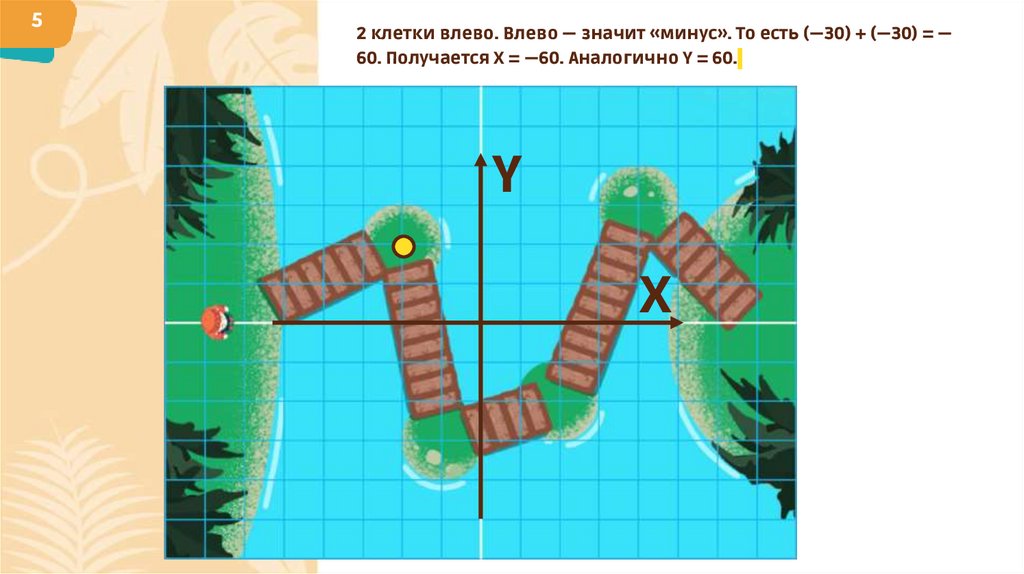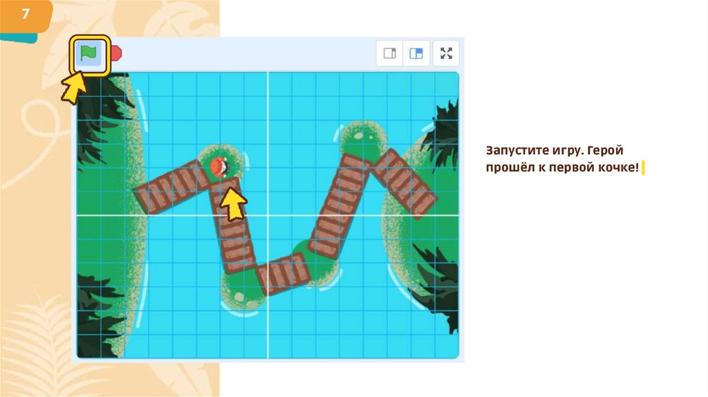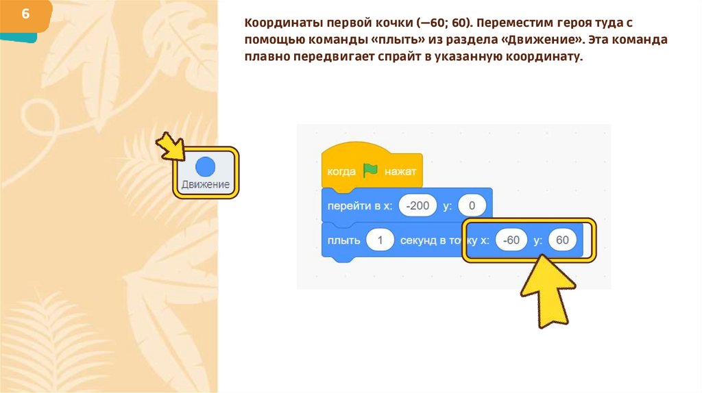 6Координаты первой кочки (—60; 60). Переместим героя туда с
