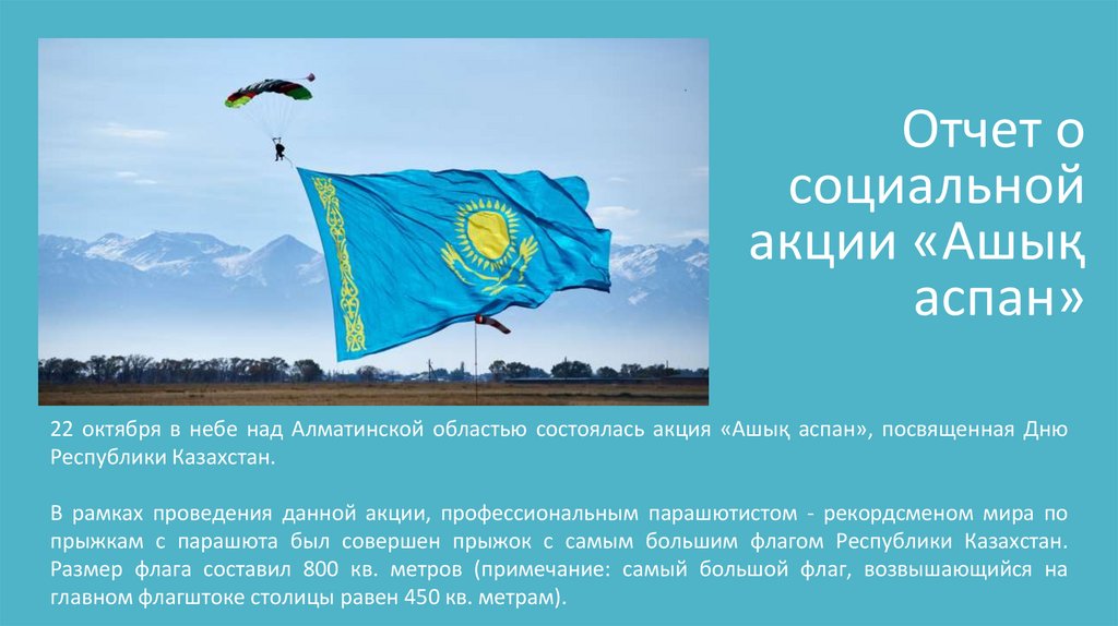 прыжкам с парашюта был совершен прыжок с самым большим флагом Республики Казахстан.