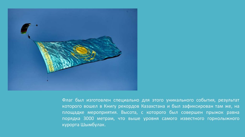 Флаг был изготовлен специально для этого уникального события, результаткоторого вошел в Книгу рекордов Казахстана и был зафиксирован там же, на