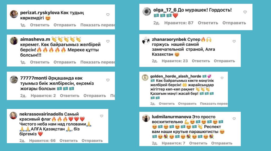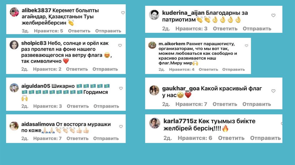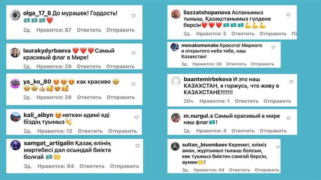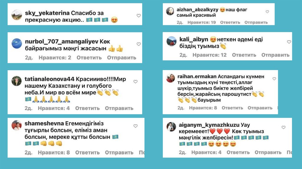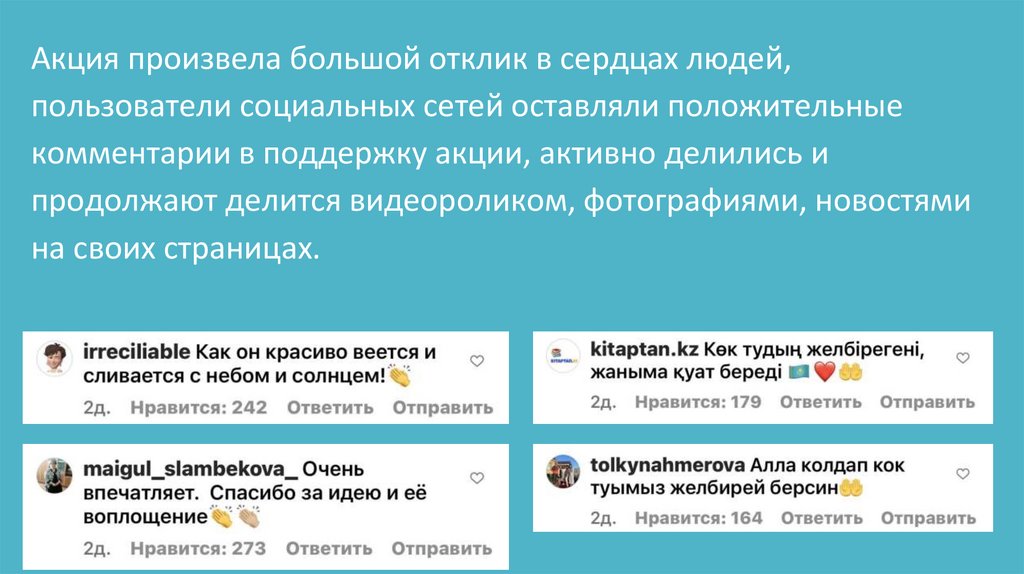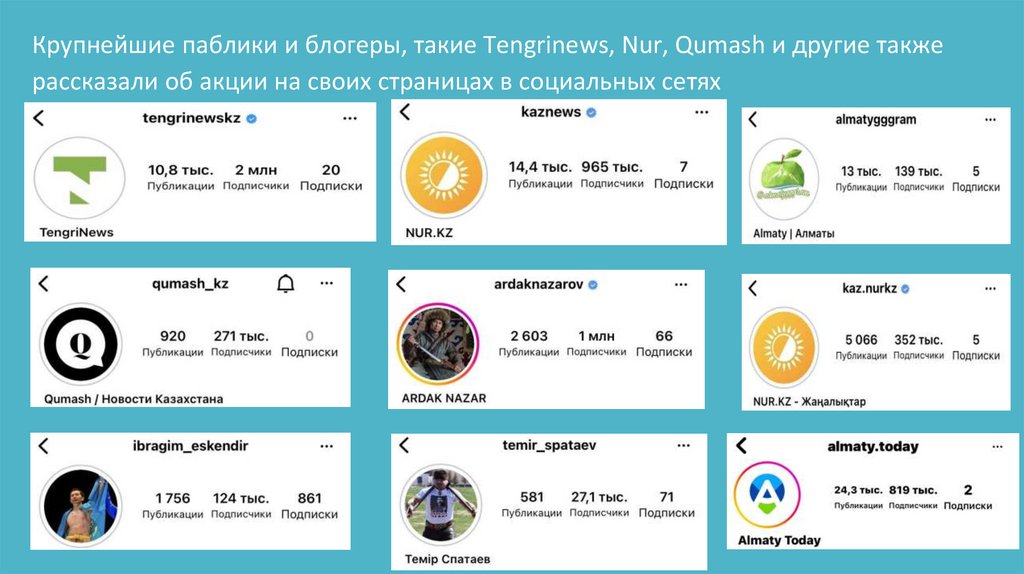 Крупнейшие паблики и блогеры, такие Tengrinews, Nur, Qumash и другие такжерассказали об акции на своих страницах в социальных сетях
