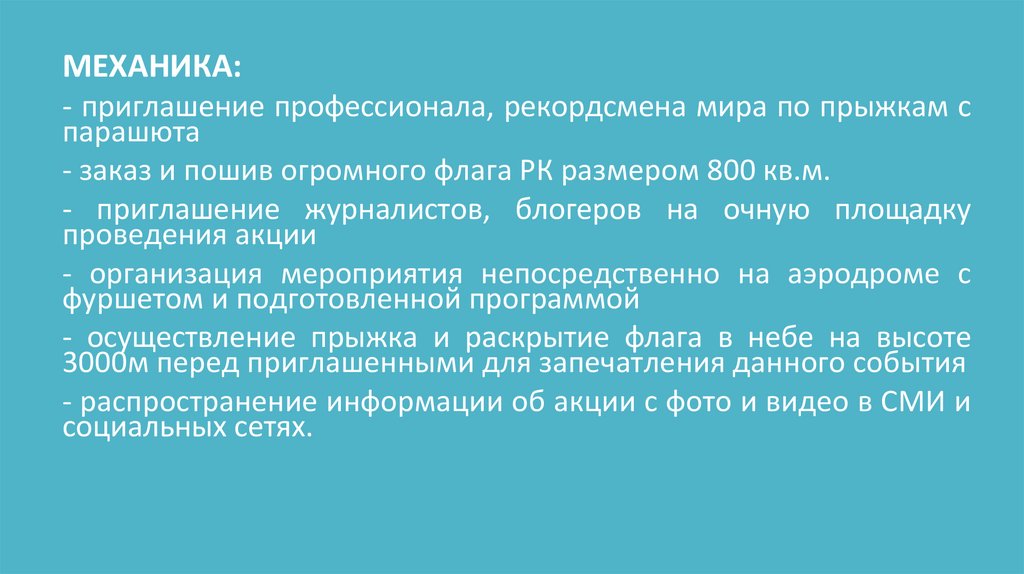 - осуществление прыжка и раскрытие флага в небе на высоте