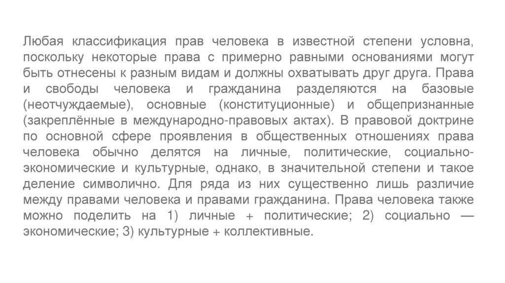 Любая классификация прав человека в известной степени условна,поскольку некоторые права с примерно равными основаниями могут