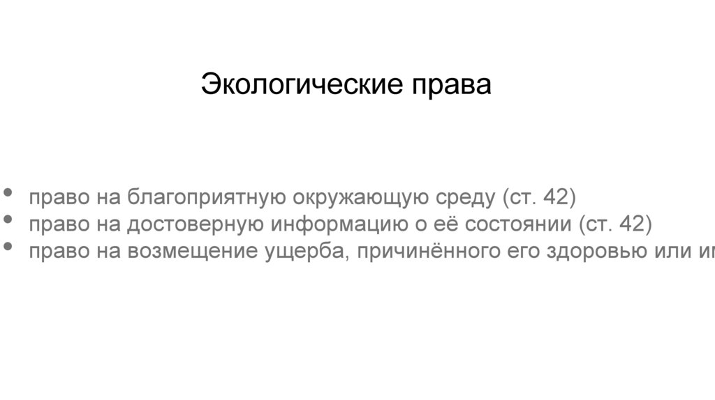 Экологические права• право на благоприятную окружающую среду (ст. 42)