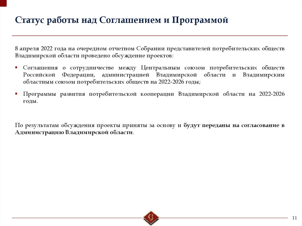 Статус работы над Соглашением и Программой8 апреля 2022 года на очередном отчетном Собрании представителей потребительских обществ