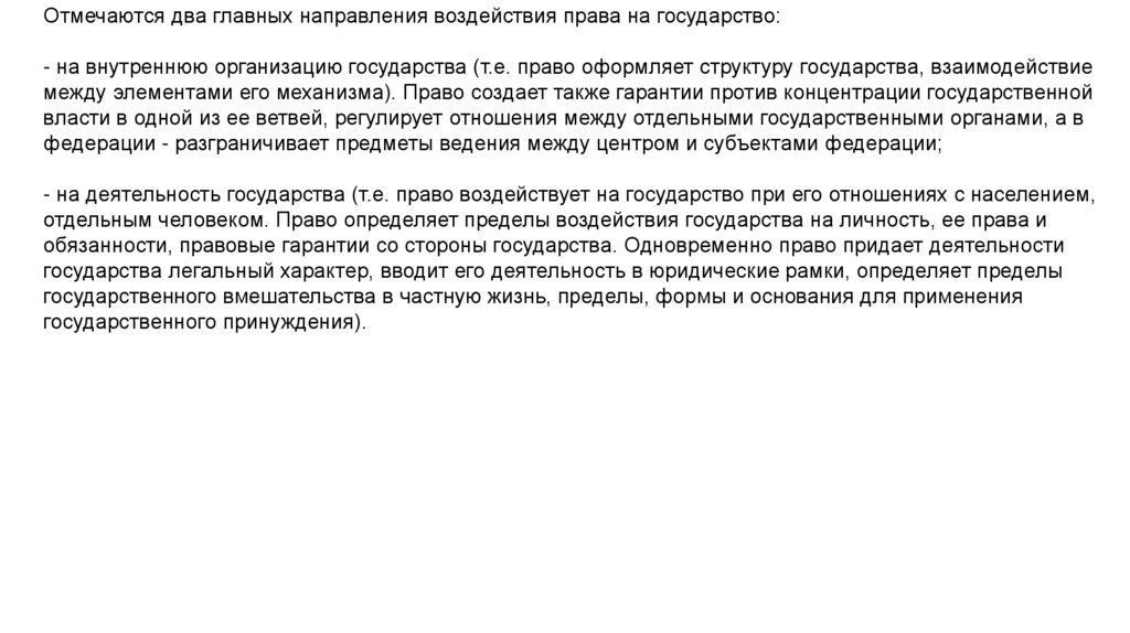 Отмечаются два главных направления воздействия права на государство:- на внутреннюю организацию государства (т.е. право оформляет структуру государства, взаимодействие