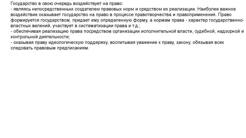 Государство в свою очередь воздействует на право:- являясь непосредственным создателем правовых норм и средством их реализации. Наиболее важное