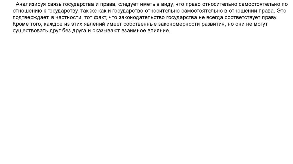 Анализируя связь государства и права, следует иметь в виду, что право относительно самостоятельно поотношению к государству, так же как и государство относительно самостоятельно в отношении права. Это