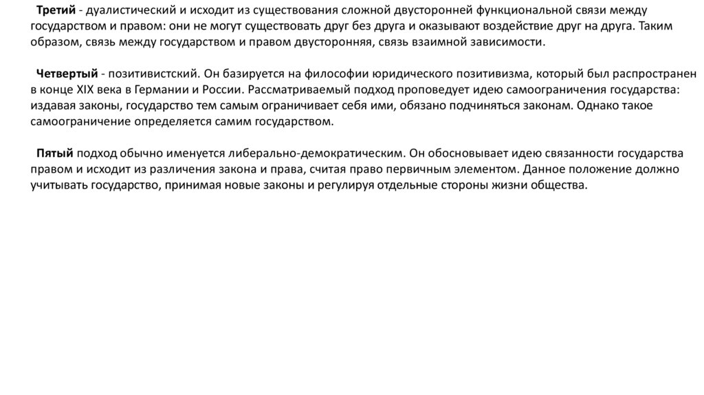 Третий - дуалистический и исходит из существования сложной двусторонней функциональной связи междугосударством и правом: они не могут существовать друг без друга и оказывают воздействие друг на друга. Таким